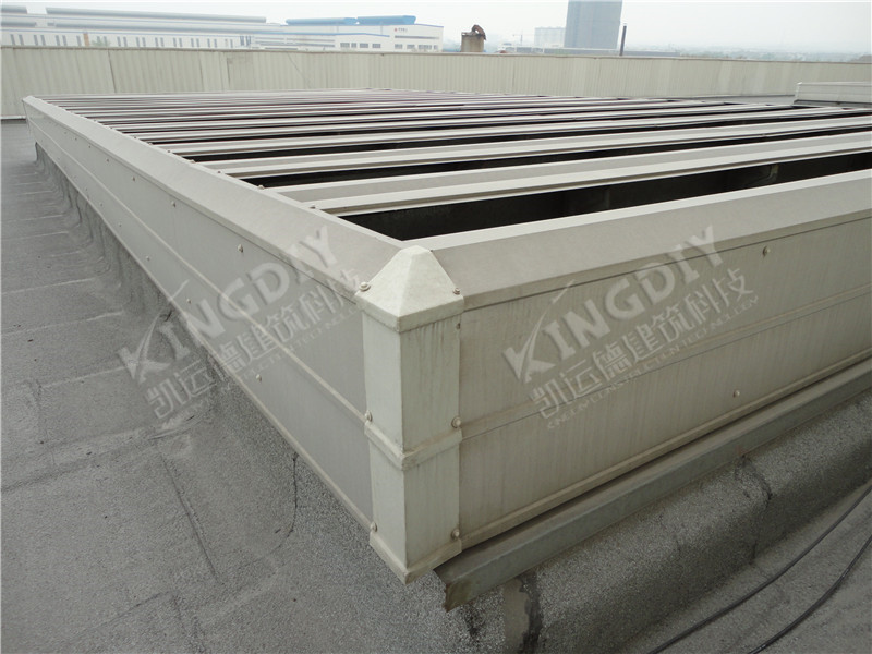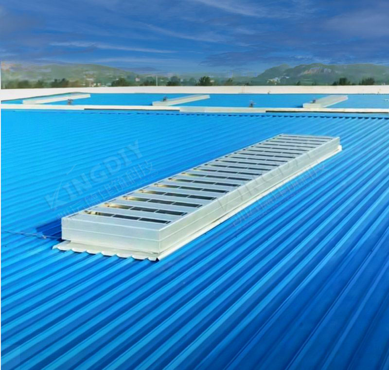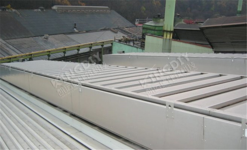 薄型通风天窗骨架为型材压制成形,可方便的进行模块化单元组合,满足不同尺寸要求。该类通风天窗高度较低,自重轻,对屋面产生的荷载小,抗风性好。相对于大型自然通风器,其结构耗钢量少,有效降低成本,是工业屋面通风器的常用选型。